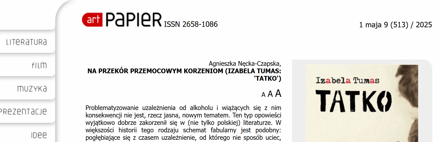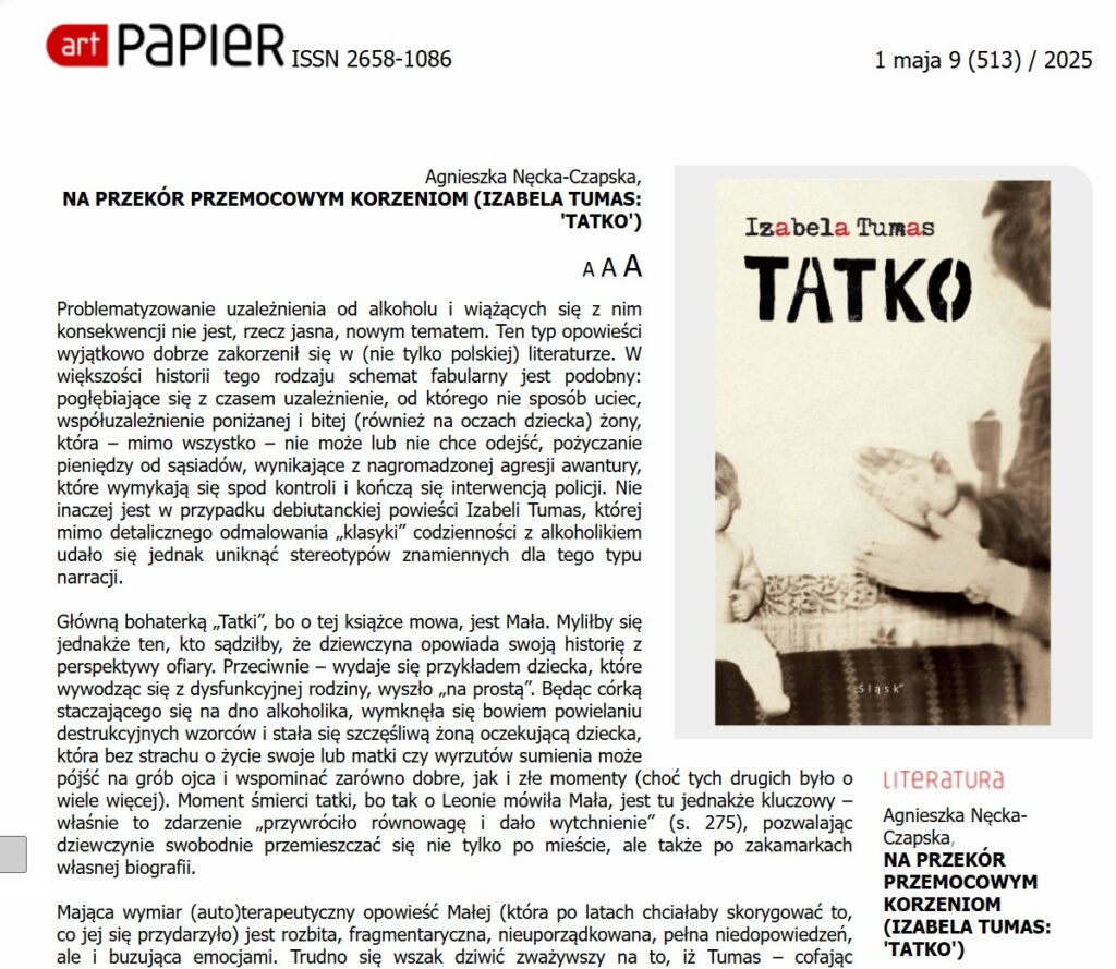 W Dwutygodnik kulturalny „artPAPIER” pojawiła się właśnie najnowsza recenzja „Tatki” – NA PRZEKÓR PRZEMOCOWYM KORZENIOM. Jej autorką jest prof. Agnieszka Nęcka-Czapska – literaturoznawczyni, krytyczka literacka, pracowniczka Instytutu Literaturoznawstwa na Uniwersytecie Śląskim w Katowicach.