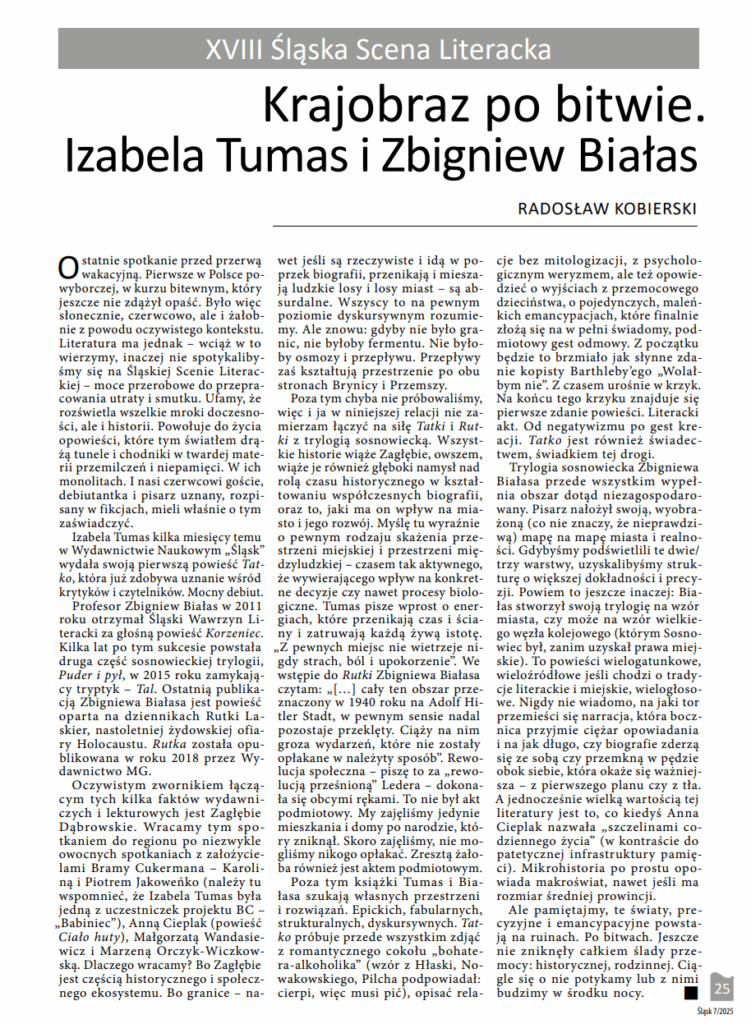 „Mocny debiut” – pisze o „Tatce” Radek Kobierski w miesięczniku „Śląsk”n(7/2025). To podsumowanie czerwcowego spotkania na Śląskiej Scenie Literackiej, w którym brałam udział z prof. Zbigniewem Białasem.