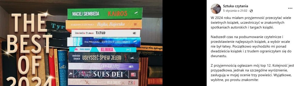 Topyby Izabela Tumasin Recenzjaon Posted on 06/01/202502/02/2025 Na początku stycznia „Tatko” trafił też do TOP-ów na tych blogach czytelniczych: https://ksiazkoweinspiracjepbw.blogspot.com/2024/12/10-najlepszych-ksiazek-2024-roku.html?spref=fb&fbclid=IwY2xjawH11JZleHRuA2FlbQIxMQABHXnO3C5nAiVM1VTgMhii_d9YoXMnad72jVderk3dkQAddjQ7eR8Zc7nfwQ_aem_MdOTT8NNFd7iRgdAjom97Q https://www.facebook.com/photo/?fbid=1204538684568322&set=a.566397251715805